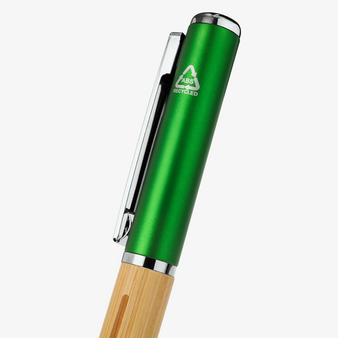 Hochwertiger Drehkugelschreiber aus Bambus und recyceltem ABS-Kunststoff mit integrierter LED-Taschenlampe inklusive Knopfzellenbatterie.